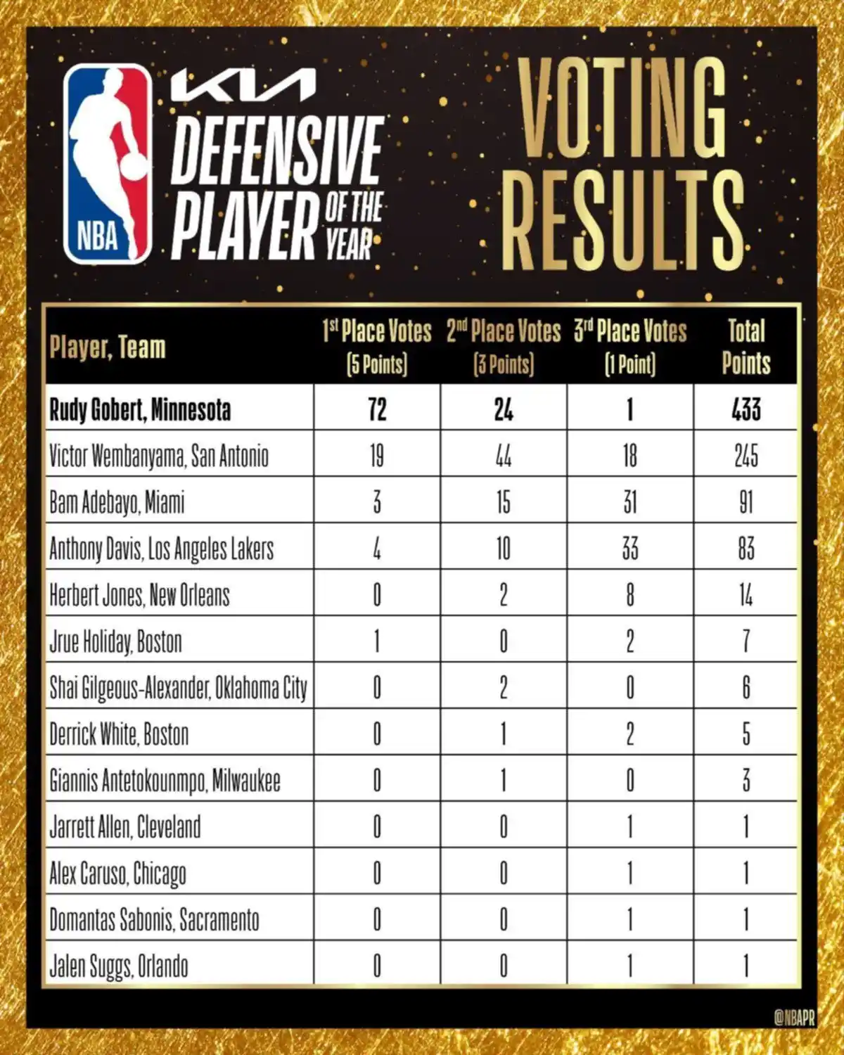 Rudy Gobert obtuvo su cuarto reconocimiento al Jugador Defensivo del Año de la NBA, luego de los conseguidos en 2018, 2019 y 2021. El de los Wolves, que había conseguido los tres anteriores con la camiseta de Utah Jazz, se unió a Ben Wallace y Bikembe Mutombo en el selecto grupo de los cuatro veces ganadores de este premio. A los 31 años y en su 11º temporada promedió 9,2 rebotes defensivos y fue vital para que la de Minnesota fuese la mejor defensa de la NBA. Sus rivales promediaron 108,4 puntos por cada 100 posiciones, dos menos que ante Boston Celtics, la segunda mejor defensa. Sobre Gobert, tres veces All-Star, muchos se han preguntado luego de esta semana si se trata del mejor defensor de la historia de la liga.