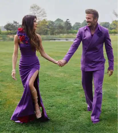 Victoria y David Beckham celebran su 25 aniversario recreando las fotos de su icónica boda vestidos de violeta.