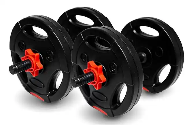 En el combo de la oferta ofrece cuatro discos de 2.35 kg. un diámetro de disco de 23cm, dos barras de plástico y cuatro roscas ajustables de 300g.