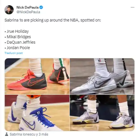 En su perfil de X publicó cuatro pares de zapatillas de la marca de Sabrina que se vió en otros partidos. “Los Sabrina 1 están mejorando en la NBA, vistos en: • Jrue Holiday • Mikal Bridges • DaQuan Jeffries • Jordan Poole”, indicó en su perfil De Paula.