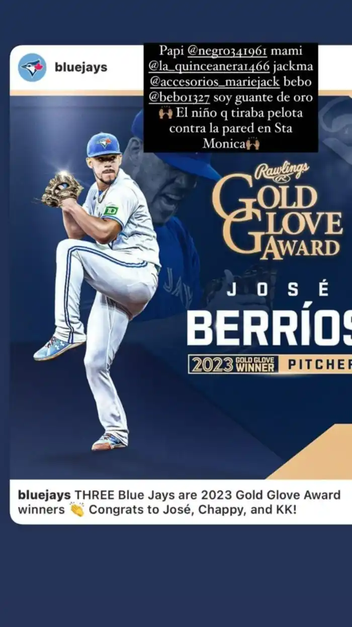 Minutos después de ser anunciado como uno de los ganadores del Guante de Oro 2023, el puertorriqueño José Berríos publicó un emotivo mensaje en sus redes sociales: “Papi, mami, bebo, soy guante de oro, el niño que tiraba la pelota contra la pared en Santa Mónica”