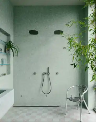 El dormitorio principal, monocromático y de color menta, cuenta con una moqueta de pared a pared de la que parece formar parte la cama, de terciopelo y metal cromado. Está vestida con una colcha confeccionada con restos de tela de la colección de taburetes tapizados que Grattan realizó para la galerista Cristina Grajales.