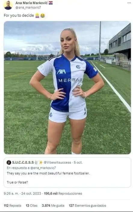 A través de X (Twitter), un fan de la croata cuestionó su belleza y le preguntó si era la futbolista más guapa del mundo, Markovic le respondió con una foto con el uniforme de su equipo, el Grasshopper, y dejó que sus propios seguidores le solucionaran la duda a este usuario.