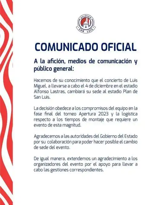 Aunque la gira de Luis Miguel sí llegará a San Luis como estaba planeado, de último minuto se anunció un cambio en la ubicación del evento todo por la celebración de la Liguilla del torneo apertura de la Liga MX.